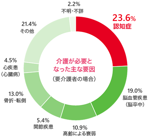 介護が必要になった原因で最も多いのは認知症、また64歳以下でも介護を必要とすることがあります。