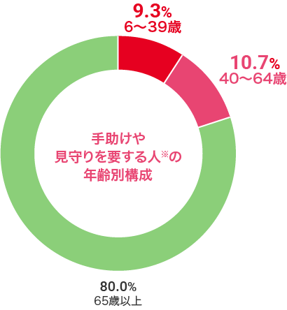 ※「手助けや見守りを要する人」とは、歩行・移動、着替え、洗面、食事、排せつ、入浴等に際してなんらかの手助けや見守りを必要とする人や、意思疎通が困難な人、公的介護保険制度により「要支援」「要介護」の認定を受けている人などをいいます。