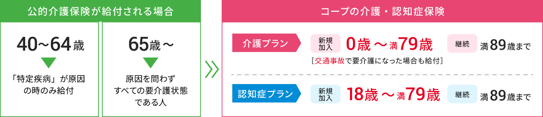 要介護状態40歳未満 対象外(40歳未満は公的介護保険制度の対象外) 年齢・要介護状態になった原因を問わず対象(交通事故なども対象) 40~64歳